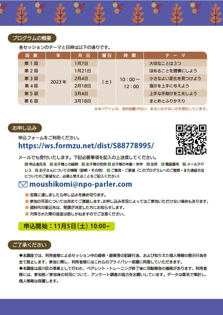 - お子様が医療や相談等にかかっている場合、主治医や担当の相談員から当プログラム参加の許可を得られること