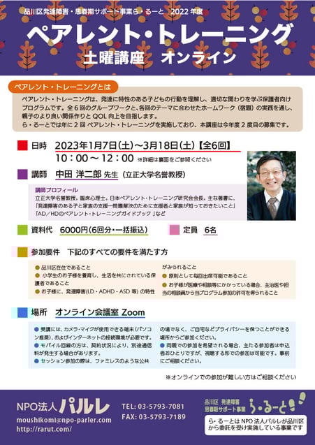 - 本講座は品川区の事業として行われ、ペアレント・トレーニング終了後に活動報告の義務があります。利用者様には、参加前/参加後の状況について、アンケート調査に協力をお願いしています。データは匿名で集計し、個人情報は厳重に保護します。