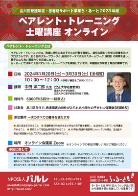 - 本講座は品川区の事業として行われ、ペアレント・トレーニング終了後に活動報告の義務があります。利用者様には、参加前/参加後の状況について、アンケート調査に協力をお願いしています。データは匿名で集計し、個人情報は保護します。