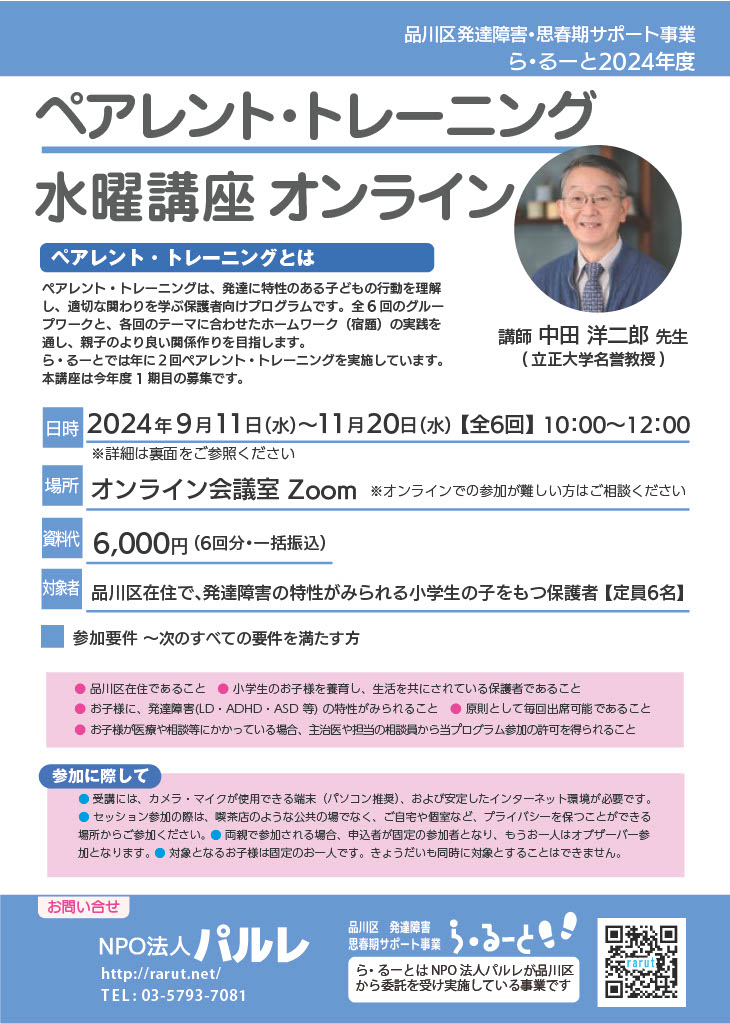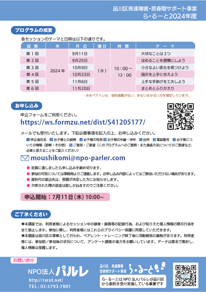 - 本講座は品川区の事業として行われ、ペアレント・トレーニング終了後に活動報告の義務があります。利用者様には、参加前/参加後の状況について、アンケート調査に協力をお願いしています。データは匿名で集計し、個人情報は保護します。