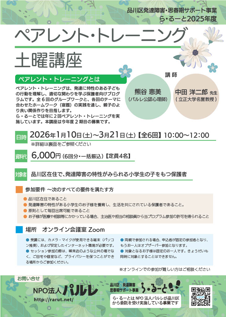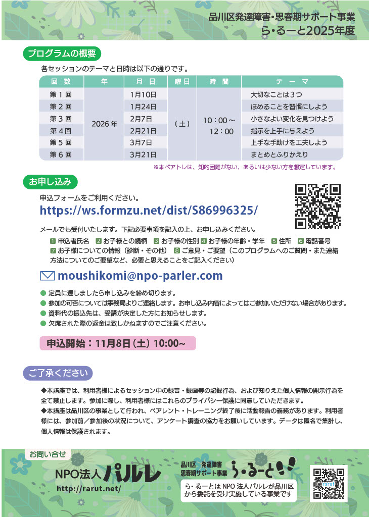- 本講座は品川区の事業として行われ、ペアレント・トレーニング終了後に活動報告の義務があります。利用者様には、参加前/参加後の状況について、アンケート調査に協力をお願いしています。データは匿名で集計し、個人情報は保護します。